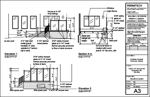 Our office work on various types of residential decks including new deck development to exist decks without permits. We provided all the require drawings for this wood deck with vinyl handrail and guardrail and coordinated both the Development and Building Permits including final inspection with the City of Edmonton.